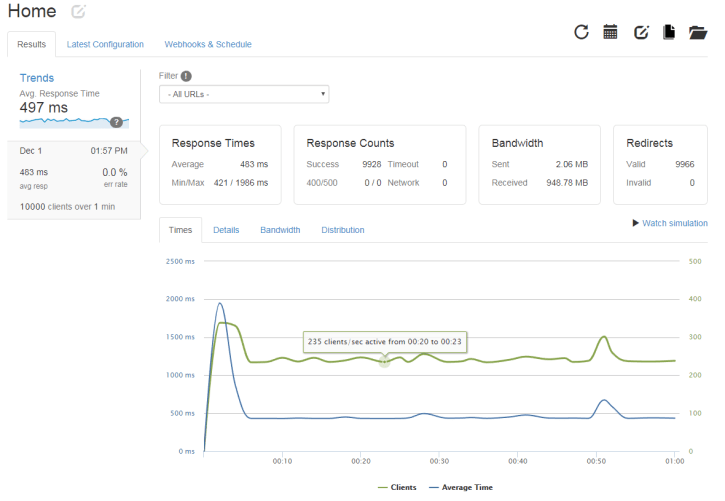 Tôi chưa xác định cụ thể được con số khách có thể truy cập cùng lúc với EasyEngine, vì họ quảng cáo là config riêng để chịu tải, tuy thế khi thử ở các bài test như loader.io thì với cấu hình cơ bản có sẵn sử dụng REDIS CACHE nó có thể chịu tải với 10.000 lượt truy cập trong 1 phút là vẫn thoải mái ở tốc độ bình quân < 500ms (0.5s), ah, còn nếu không dùng bất cứ cái gì để cache thì cỡ 250 truy cập 1 phút là … sập server :]]