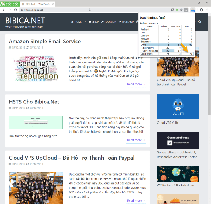 Cụ thể nhất là trang home của thèng bibica.net, trong điều kiện tốt nhất, nó có thể xuống được 1 con số hoang đường 71ms (0.071s) để load xong 😛